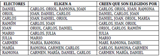 - Los valores se ponderan en función del número de elecciones posibles (si es posible únicamente elegir a dos personas, damos un 2 al que ha sido elegido primero y un 1 al elegido después)