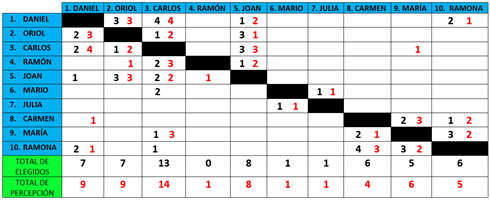 Pasamos los datos a una tabla de doble entrada, donde los números negros representan a que compañeros han elegido y los rojos quien creen que les va a escoger. Los valores se determinan en función del orden de selección. Las primeras elecciones reciben los valores más altos.